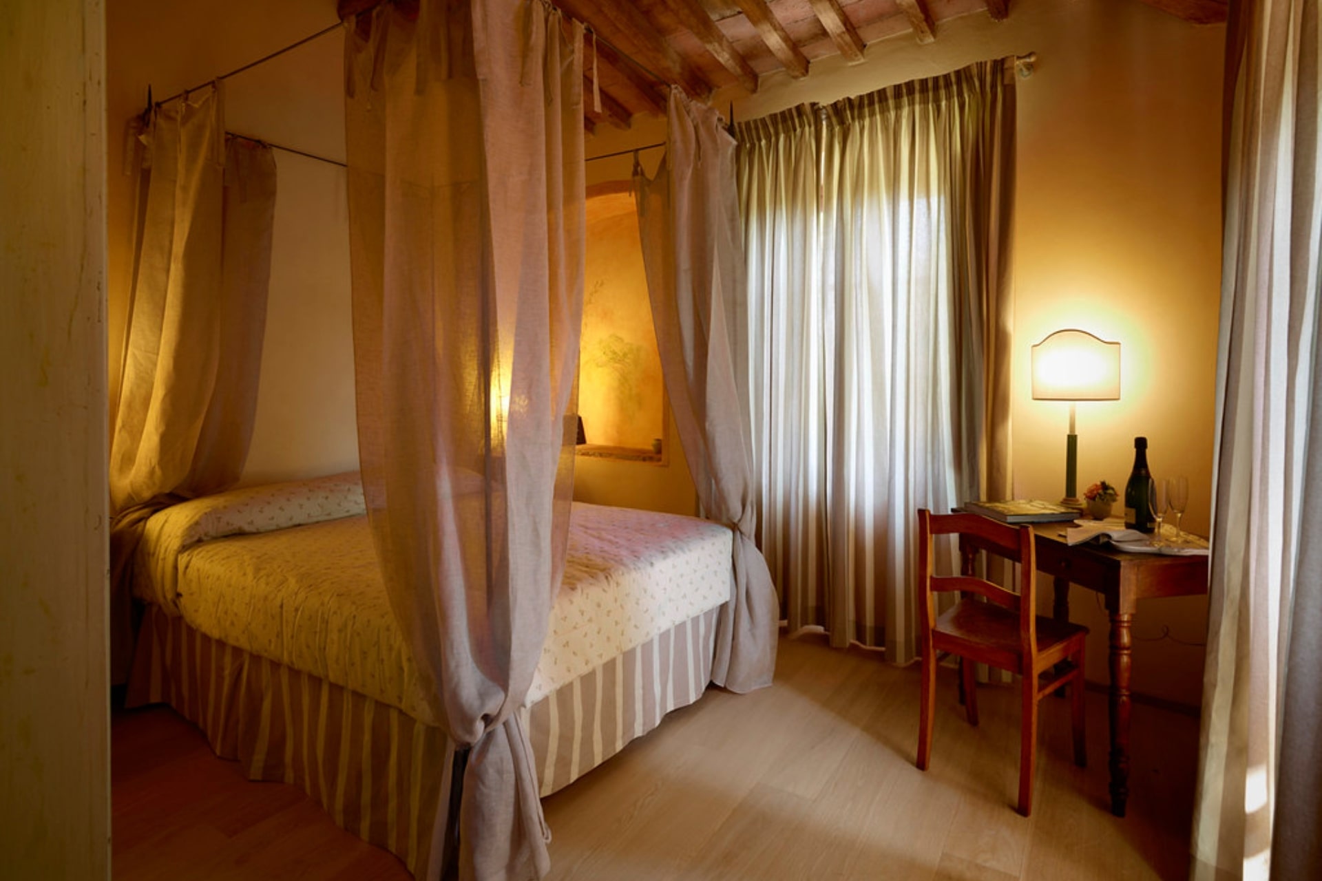 Suite composta da un ampio soggiorno, bagno con vasca, camera da letto matrimoniale con baldacchino, camera con 2 letti separati, vista sulla corte interna e sulla vallata che guarda il paese di Barberino Val d’Elsa.
