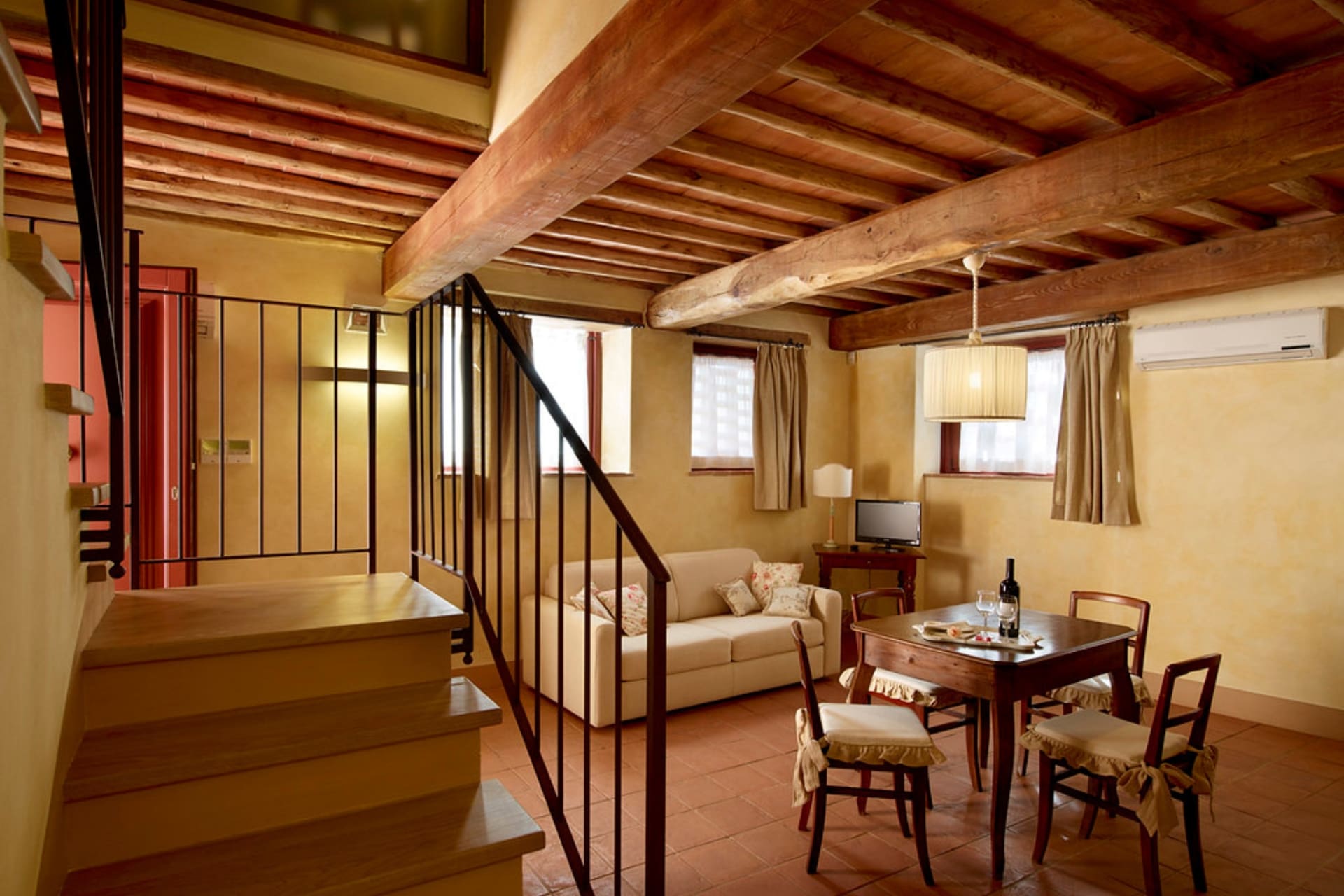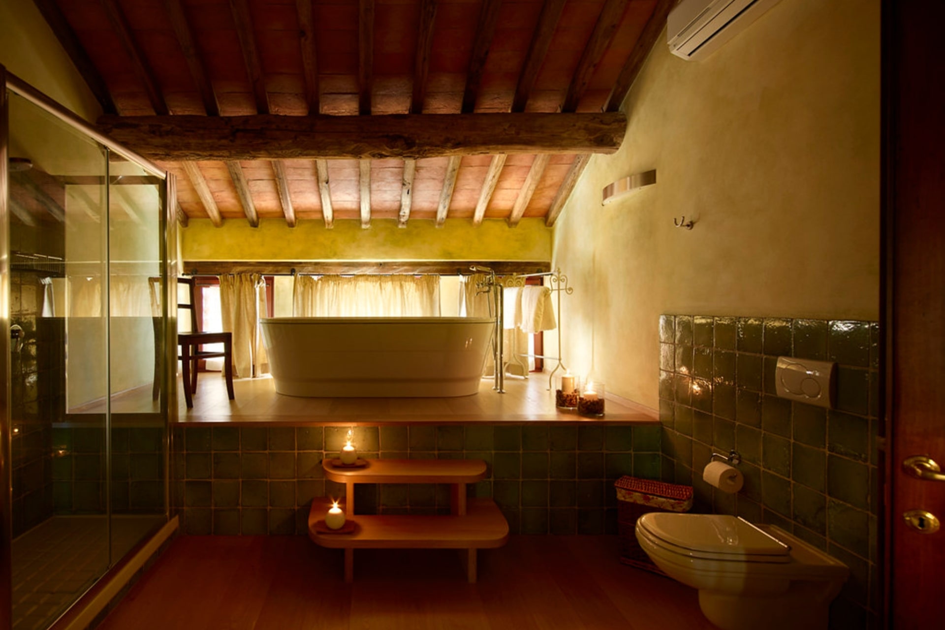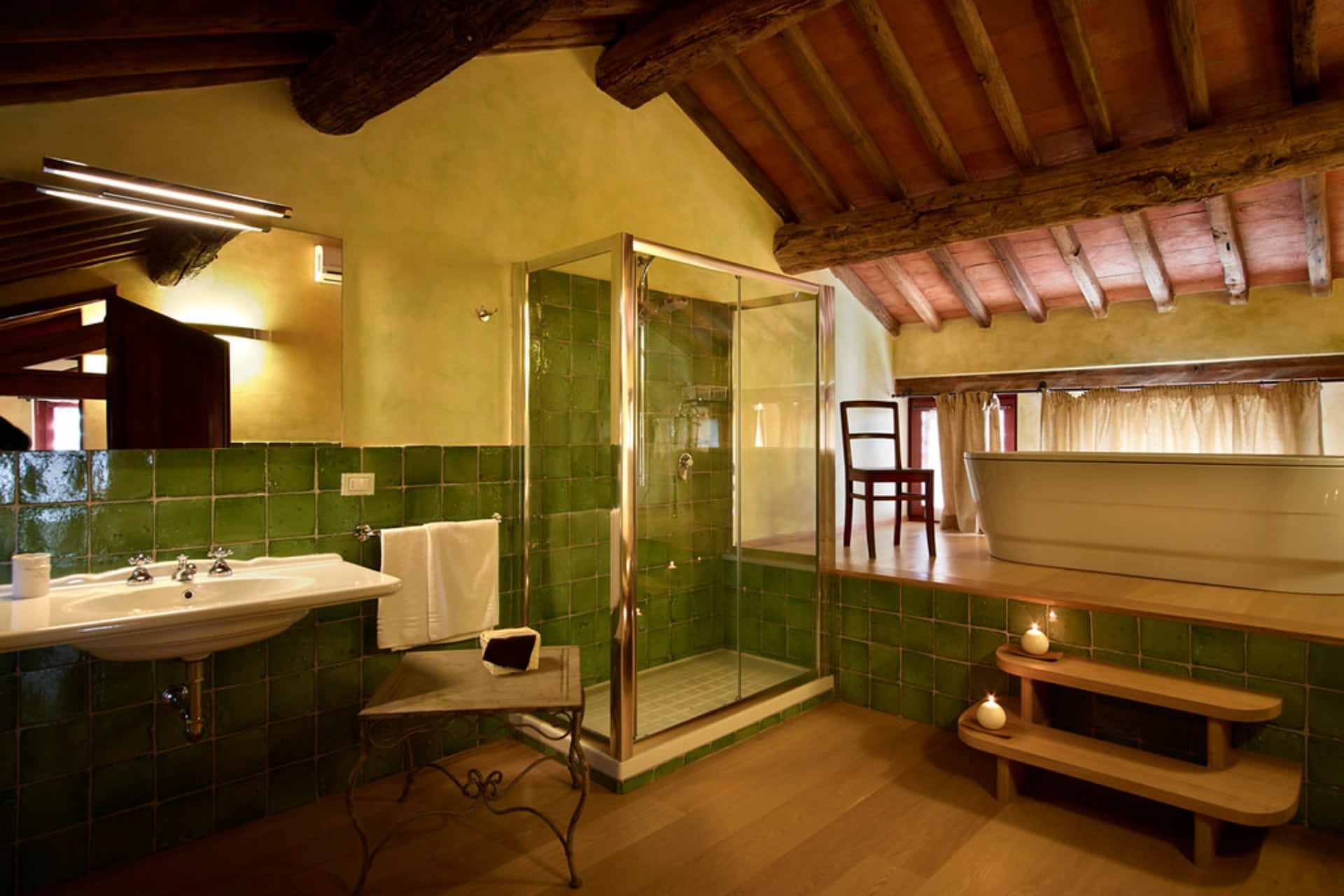 I soffitti a cassettoni, i pavimenti in cotto e parquet e le finestre a grigliato richiamano i vecchi fienili delle case coloniche toscane, donando alla suite un carattere autentico e raffinato. Da qui si gode una vista suggestiva sul terrazzo del borgo e sulla valle circostante.