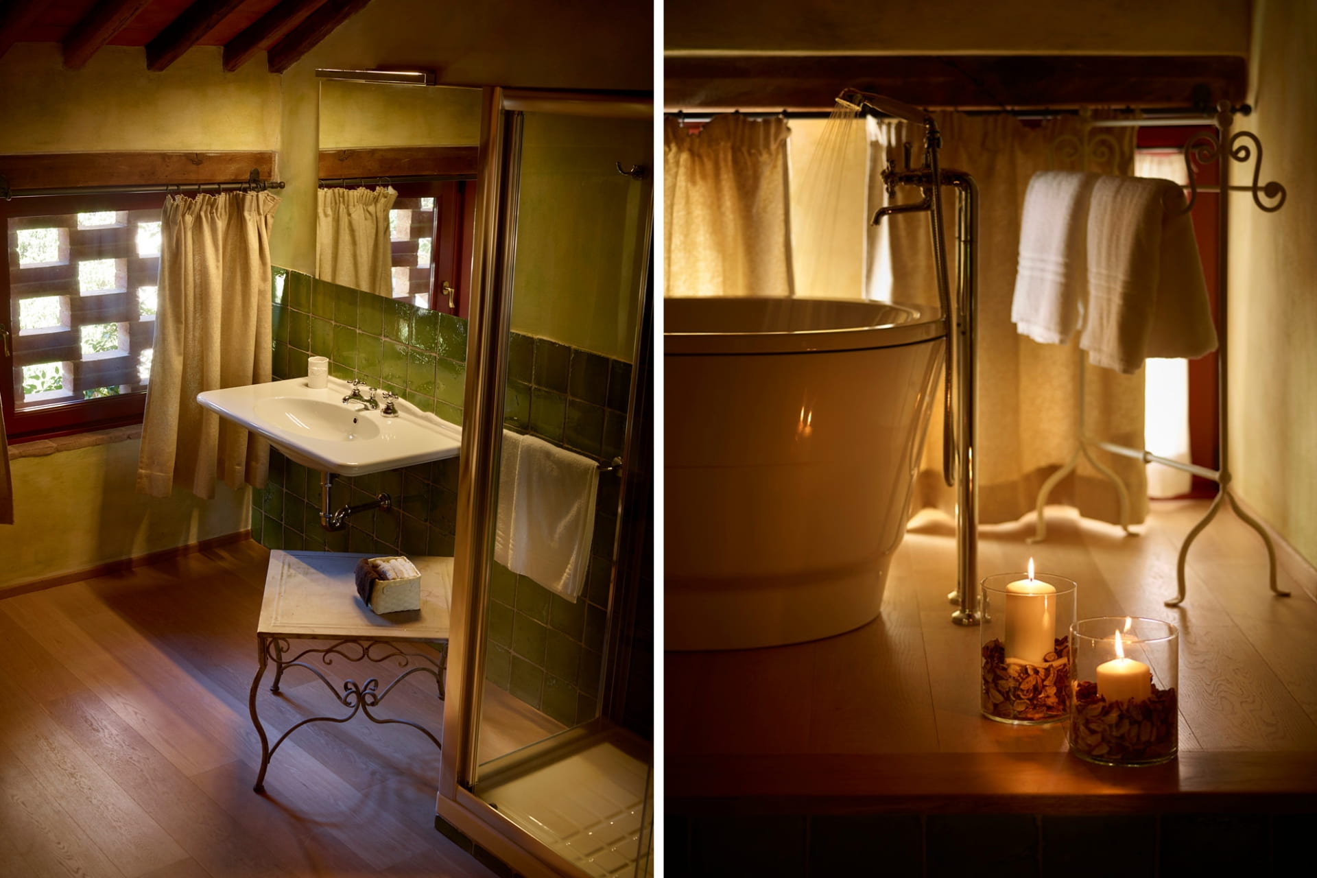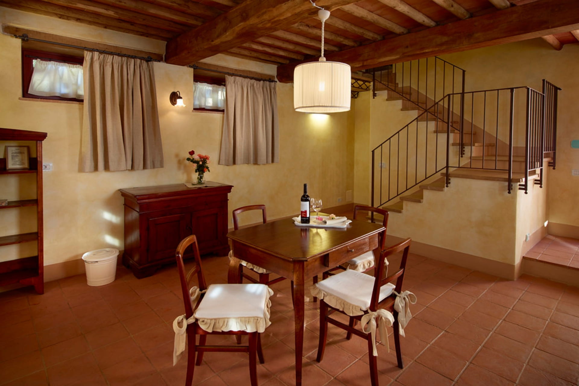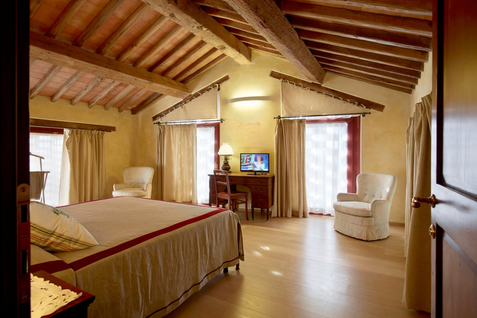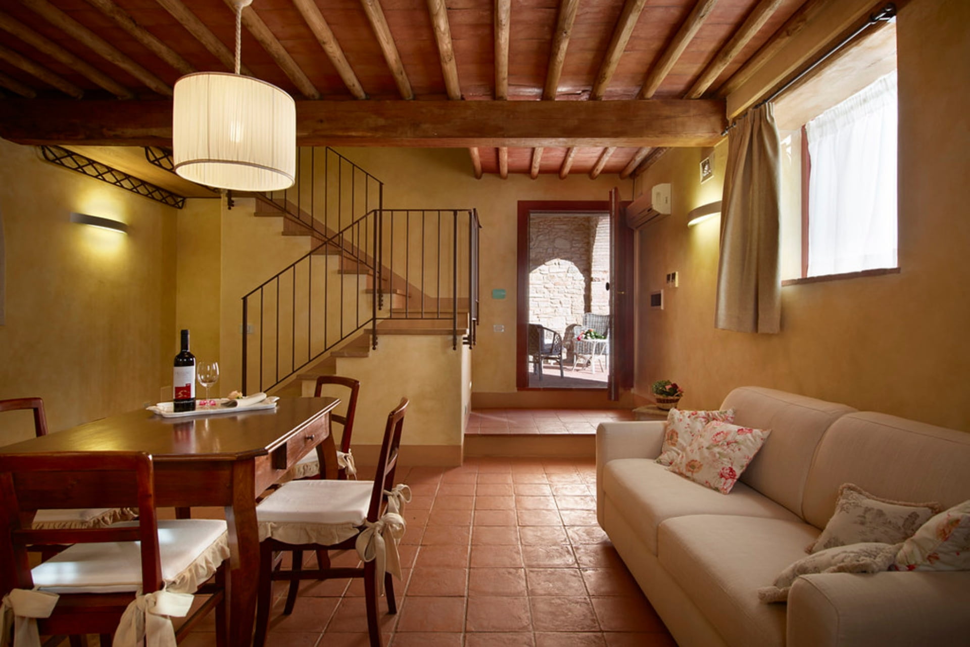 I soffitti a cassettoni, i pavimenti in cotto e parquet e le finestre a grigliato richiamano i vecchi fienili delle case coloniche toscane, donando alla suite un carattere autentico e raffinato. Da qui si gode una vista suggestiva sul terrazzo del borgo e sulla valle circostante.