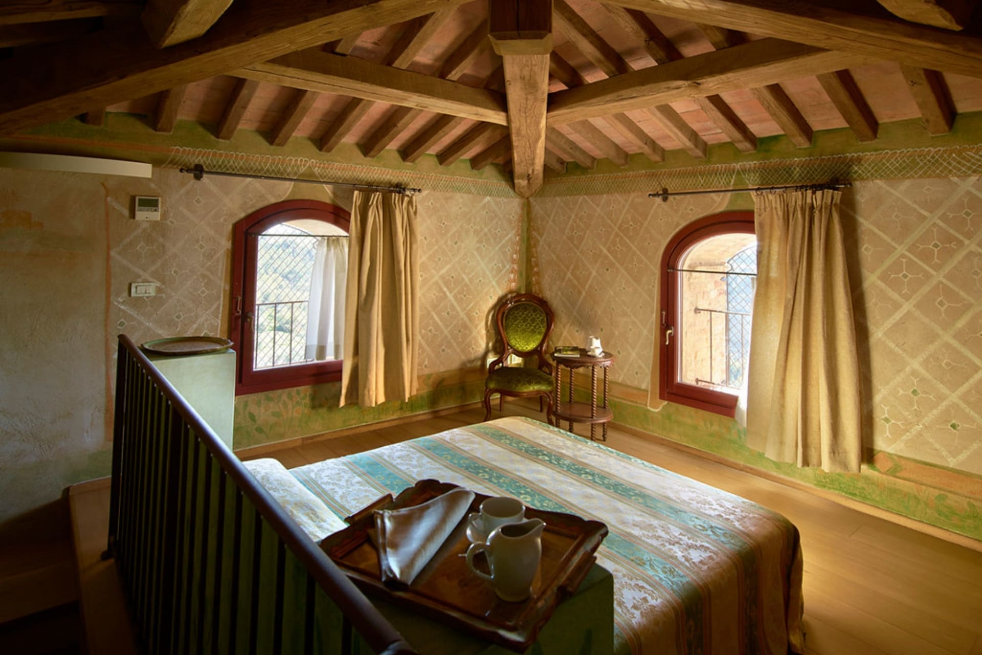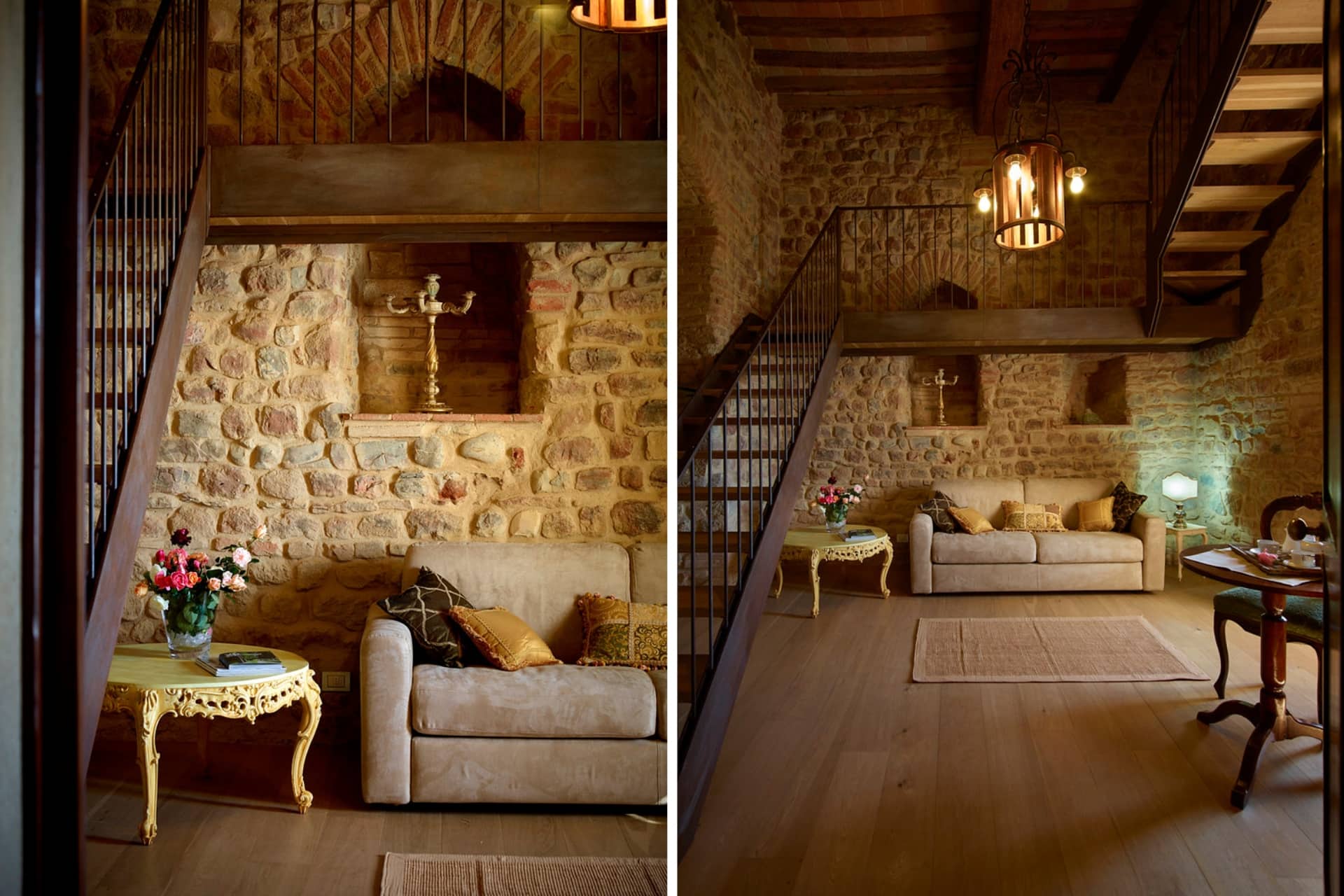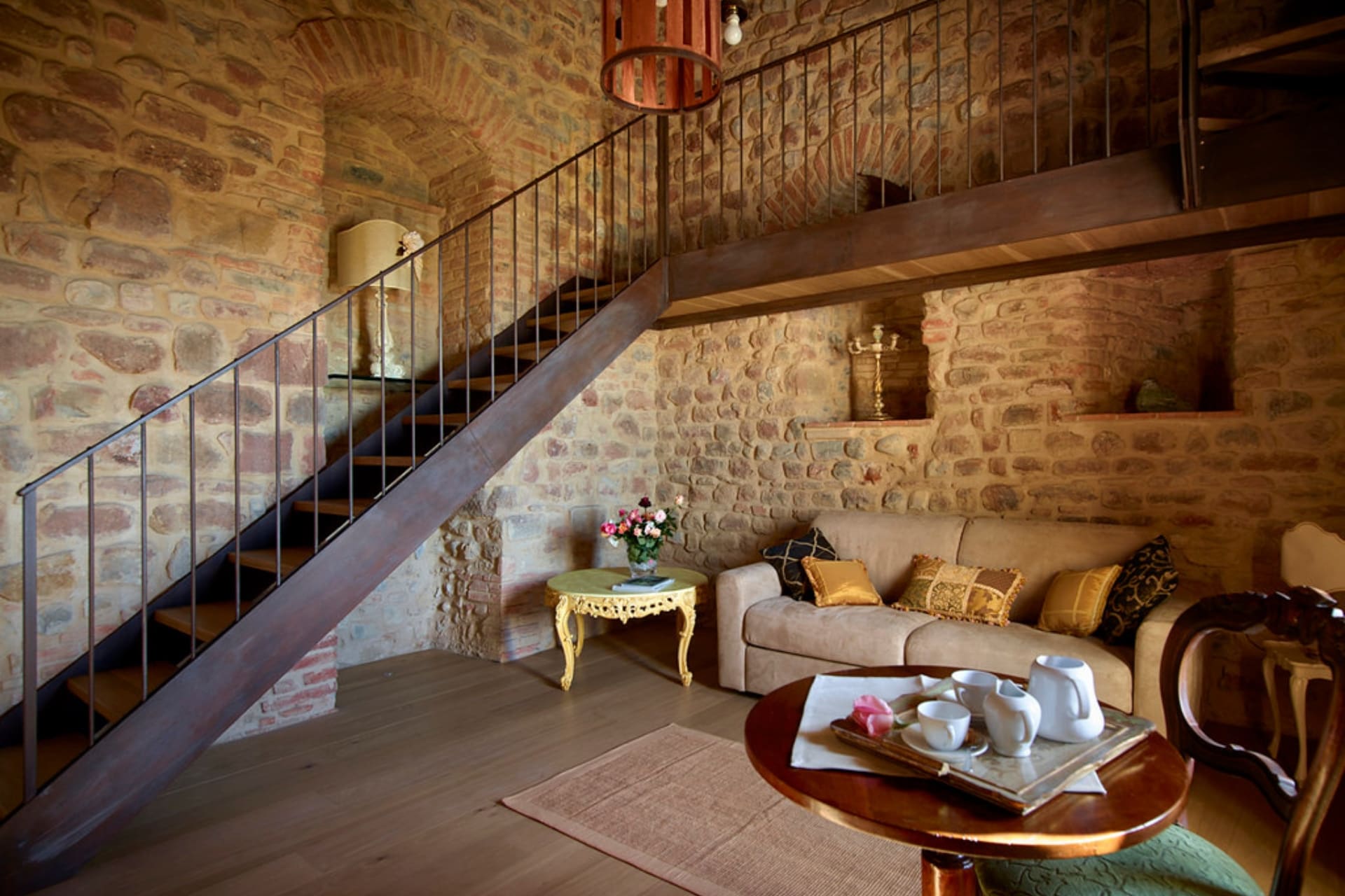 Situata all’interno della torre medievale, primo nucleo abitativo del Borgo Petrognano risalente al 1170, la Suite Torre occupa un’antica torre di avvistamento dalla quale era possibile controllare sia il versante fiorentino che quello senese, a difesa della città scomparsa di Semifonte. La suite, interamente caratterizzata da pareti in pietra, si sviluppa su tre livelli. Al primo piano si trova un accogliente salotto con divano letto matrimoniale; una suggestiva scala a giorno in legno conduce al secondo piano, dove è collocato un ampio bagno. Al terzo piano si apre la camera da letto matrimoniale, dalla quale si gode una vista mozzafiato sulle colline toscane, sulle torri di San Gimignano e fino alle montagne dell’Appennino.